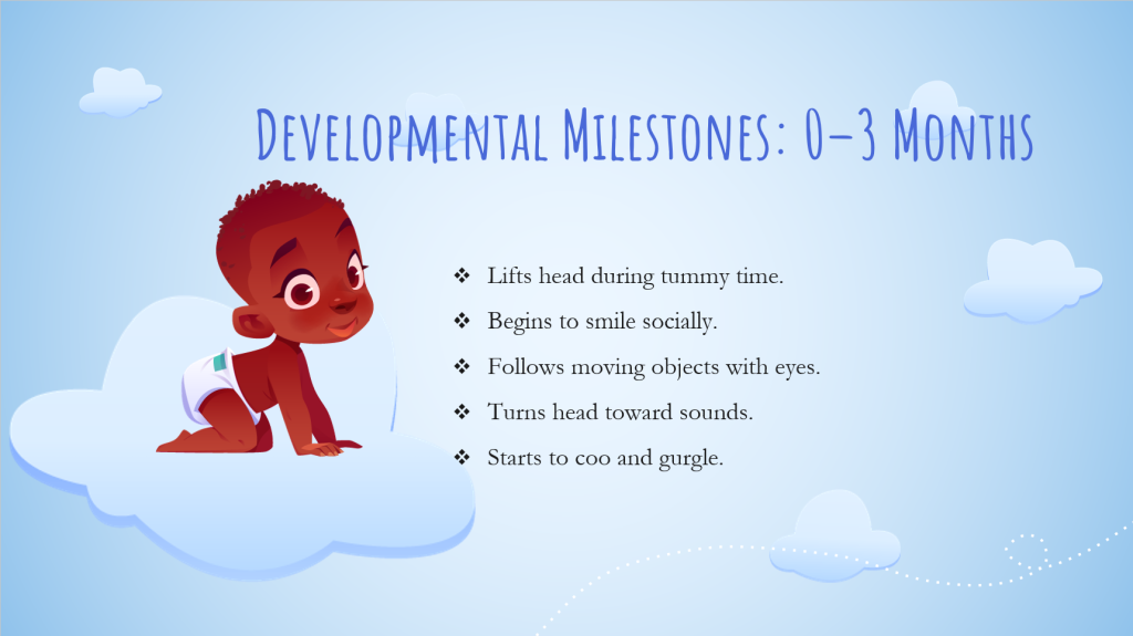 From birth to three months, infants begin developing neck strength, tracking objects with their eyes, and responding to voices and sounds. Smiling socially and recognizing caregivers are key signs of emotional development. At this stage, tummy time is vital to help strengthen their muscles. Parents should note that if a baby seems overly floppy or unresponsive to sounds, they should notify their healthcare provider (Ertem et al., 2018).