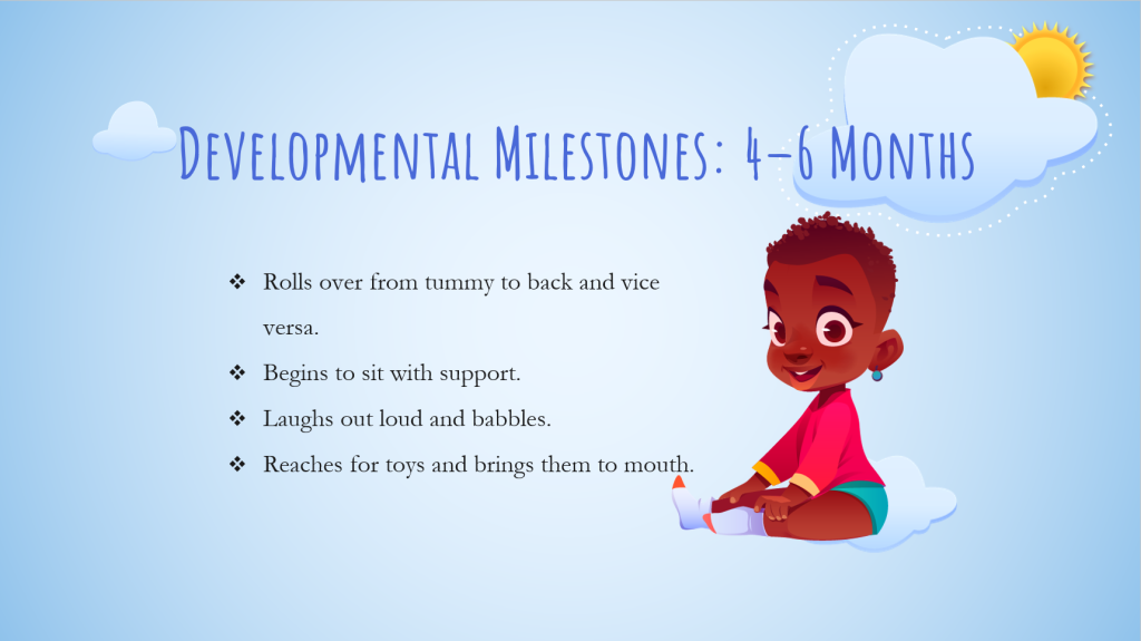 Between four and six months, most babies can roll over, reach for toys, and respond to their name. They begin to explore with their hands and mouth, which is how they learn. This is also the time when they might start sitting with support. If your baby is not showing interest in their surroundings or not making any babbling sounds, bring this up at their wellness checkup (Hannigan et al., 2023).
