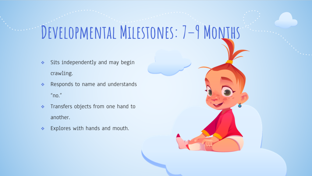 During this stage, babies often begin crawling, pulling themselves up, and developing fine motor skills such as picking up small objects. They understand familiar words and may show stranger anxiety. It’s important to encourage learning by talking, singing, and playing. Lack of movement or poor eye contact could be early signs of developmental concerns and should be addressed with your pediatrician (Hannigan et al., 2023).