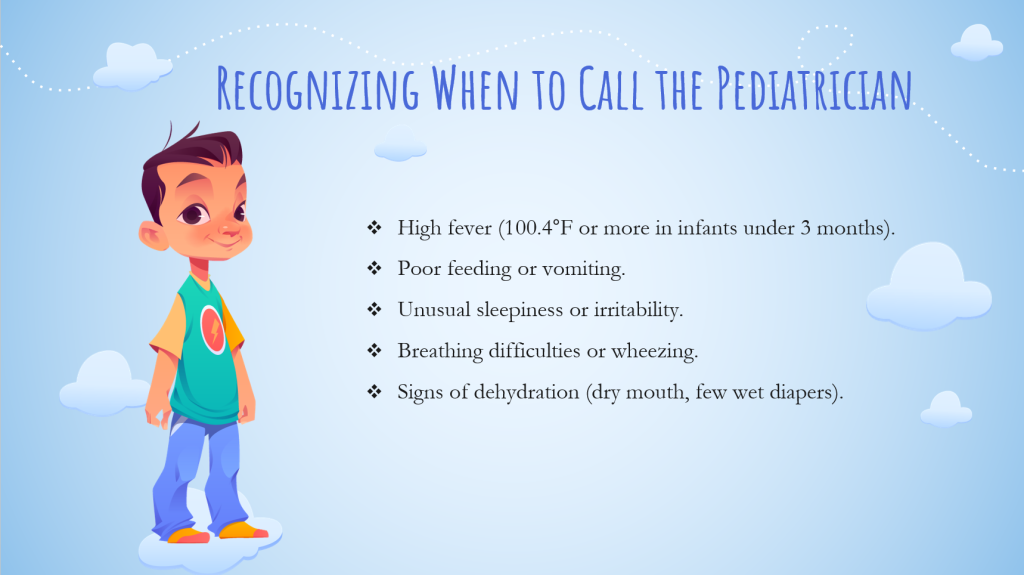 Call your pediatrician if your infant has a high fever, refuses to eat for several feedings, is vomiting, or is not producing enough wet diapers. Also call for breathing issues, skin color changes, or unresponsiveness. Keep emergency numbers handy and build a relationship with your child’s doctor so you feel supported (Kim et al., 2025).