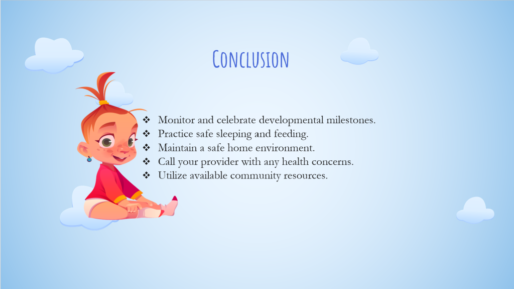 You are an RN working in the Community Outreach Department at Utopia Hospital. You have been asked to give a presentation at the local Women, Infants, and Children (WIC) Nutrition program for a group of 15 expectant mothers and interested partners/spouses/caregivers. The WIC Coordinator has asked you to provide a presentation that will cover relevant health and environmental safety topics the parents should know for the first year of life.