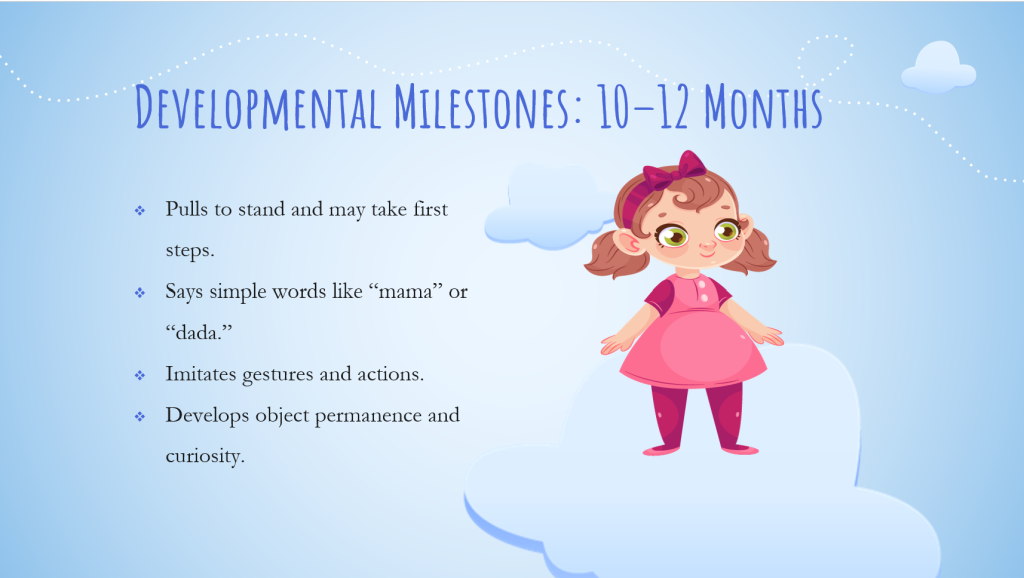 Most babies begin to cruise along furniture, stand alone, and may take first steps. They imitate others and use gestures like waving. Language skills are emerging, and many can say a few simple words. If your baby isn’t babbling or is not showing interest in standing, consult with your healthcare provider for early intervention support (Hannigan et al., 2023).