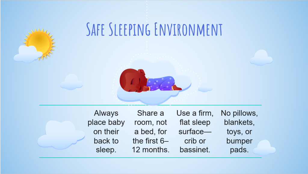 Sudden Infant Death Syndrome (SIDS) is a major concern in the first year. Infants should always sleep on their backs in a crib with a firm mattress and no loose bedding or toys. Co-sleeping should be avoided, and the room should be kept at a comfortable temperature. These steps drastically reduce the risk of sleep-related accidents (Kim et al., 2025).