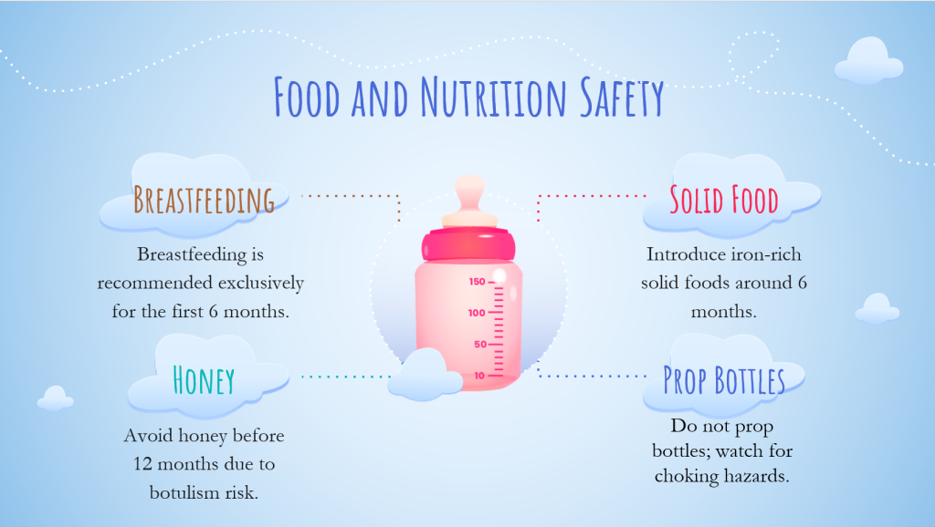 Start with exclusive breastfeeding or formula feeding until about six months, then slowly introduce pureed solids. Avoid foods like honey, whole nuts, and choking hazards. Always supervise during feeding, and know the signs of allergic reactions. Ensure bottles and utensils are sterilized, especially in the early months, to prevent infections (Kim et al., 2025).